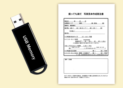 その際、事前にご用意させていただく「写真見本作成発注書」に必要事項をご記入の上、同封ください。なお、新規お申込みの際にデータ受け渡し用USBを1本プレゼントしています。