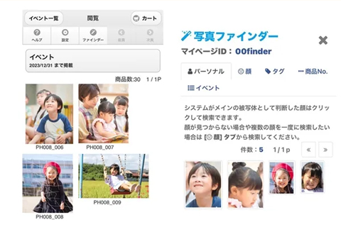 行事写真の中からお子さまを見つけるのは大変ですが、弊社では顔認識機能を使って、お子さまの顔写真を選ぶだけで該当写真を自動表示できます。