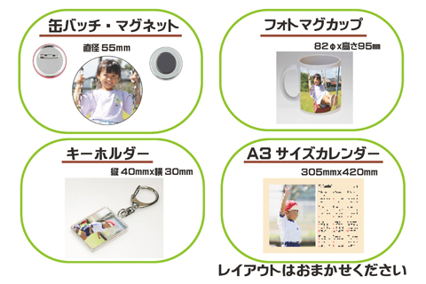 弊社で運動会、発表会、卒園式などのイベントの出張撮影依頼いただいたご利用者様に、撮影したお気に入りの写真データからフォトグッズ(キーホルダー、缶バッチ、マグネット、カレンダー、マグカップ)を半額で作成いたします。